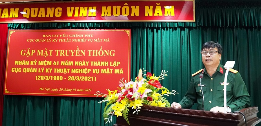 Thiếu tướng Vũ Ngọc Thiềm, Trưởng ban Ban Cơ yếu Chính phủ phát biểu tại buổi gặp mặt