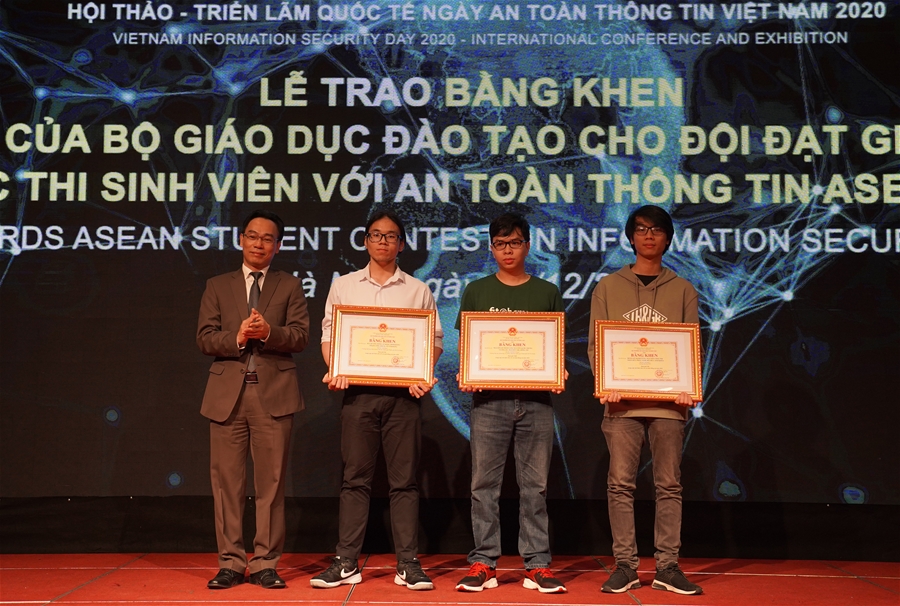 Thứ trưởng Bộ Giáo dục và đào tạo Hoàng Minh Sơn trao Bằng khen cho các sinh viên đạt giải cuộc thi Sinh viên với An toàn thông tin ASEAN 2020