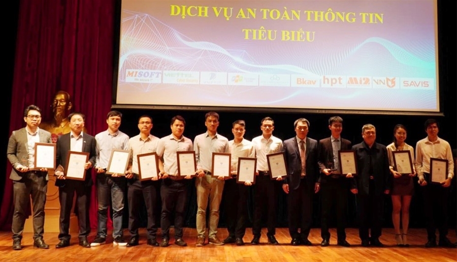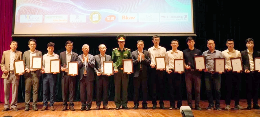Đồng chí Nguyễn Đăng Lực, Phó Trưởng ban Ban Cơ yếu Chính phủ (thứ 7 từ phải qua) và ông Nguyễn Thành Hưng, Chủ tịch VNISA (thứ 5 từ trái qua) trao giải hạng mục Sản phẩm ATTT triển vọng xuất sắc