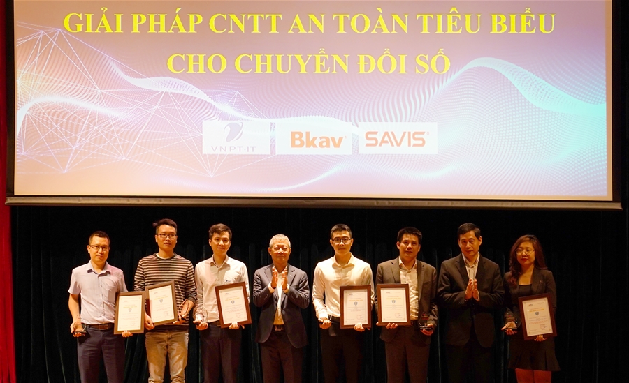 Ban tổ chức trao giải hạng mục Giải pháp công nghệ thông tin an toàn tiêu biểu cho chuyển đổi số