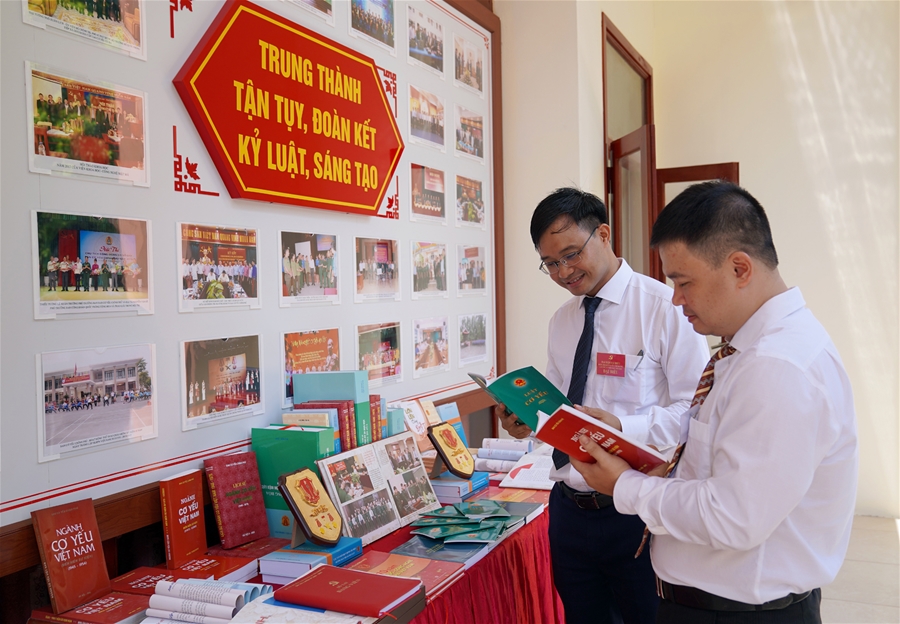 "Các đại biểu tham quan khu trưng bày ấn phẩm của Ban Cơ yếu Chính phủ"