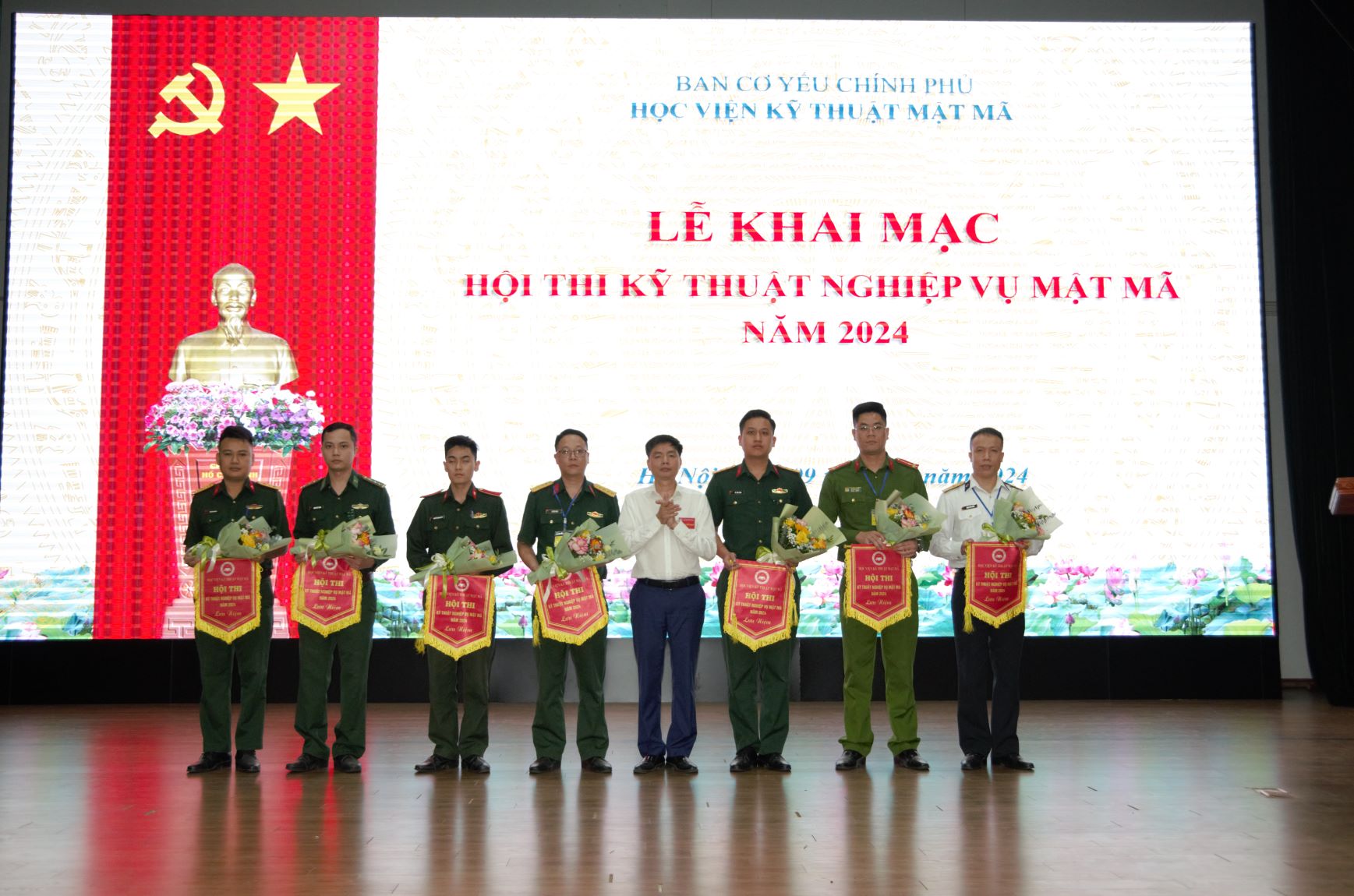 Đồng chí Hoàng Văn Thức, Giám đốc Học viện Kỹ thuật mật mã tặng hoa chúc mừng Đội tuyển tham dự Hội thi cán bộ công đoàn cơ sở giỏi Ban Cơ yếu Chính phủ năm 2024