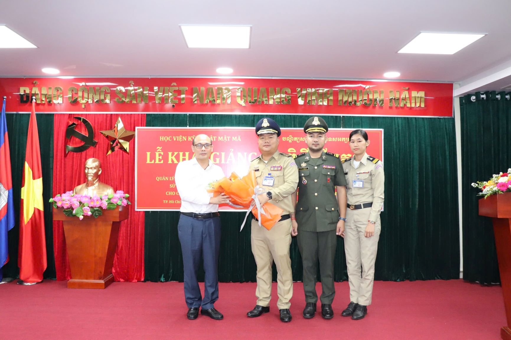 Đồng chí PGS.TS Lương Thế Dũng, Uỷ viên Thường vụ Đảng uỷ, Phó Giám đốc Học viện Kỹ thuật mật mã nhận hoa chúc mừng của học viên Campuchia nhân dịp Lễ Khai giảng năm học 2024 – 2025