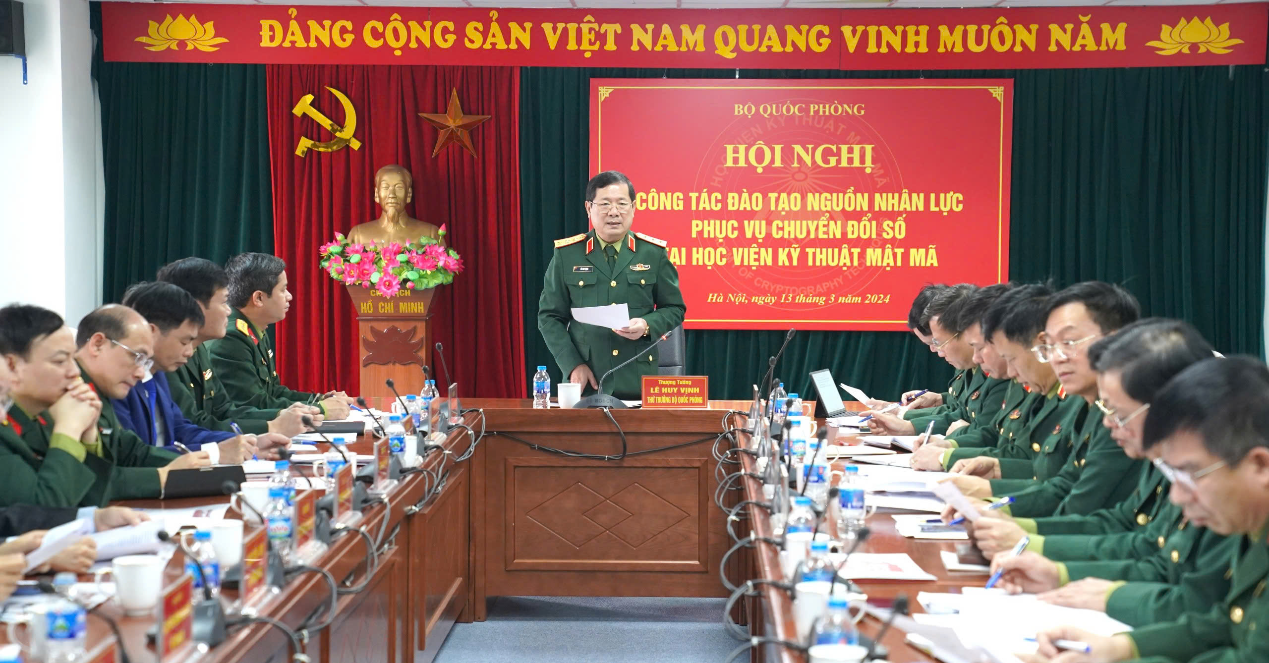 Đồng chí Thượng tướng Lê Huy Vịnh, Thứ trưởng Bộ Quốc phòng phát biểu chỉ đạo trong Hội nghị công tác đào tạo nguồn nhân lực phục vụ chuyển đổi số tại Học viện Kỹ thuật mật mã