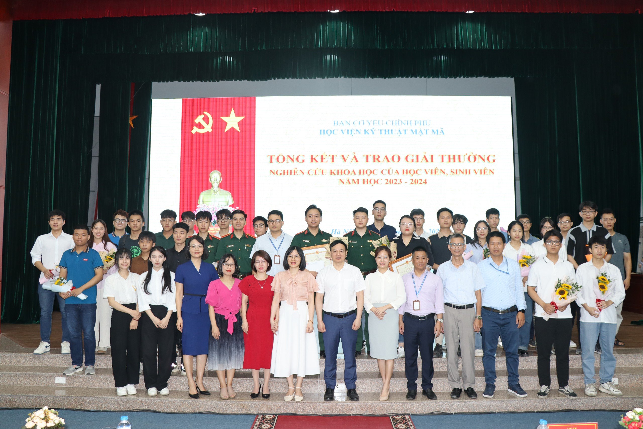 Đồng chí GS.TS Nguyễn Hiếu Minh, Phó Giám đốc Học viện Kỹ thuật mật mã cùng các đại biểu chụp ảnh lưu niệm cùng học viên, sinh viên tại buổi Tổng kết và trao giải thưởng Nghiên cứu khoa học