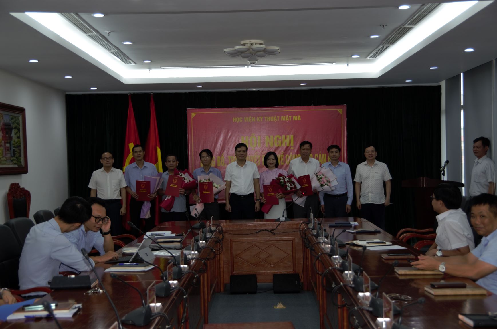 Thường vụ Đảng uỷ Học viện Kỹ thuật mật mã tặng hoa chúc mừng cán bộ được điều động và bổ nhiệm tại Hội nghị công bố, trao quyết định về công tác cán bộ