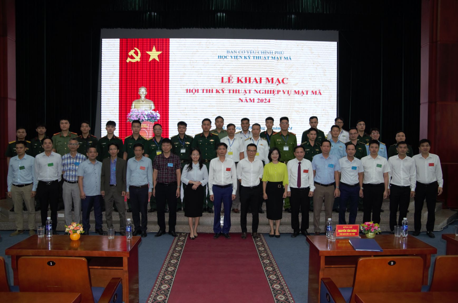 Các đại biểu chụp ảnh lưu niệm cùng các vận động viên tại Lễ Khai mạc Hội thi nghiệp vụ Kỹ thuật mật mã năm 2024