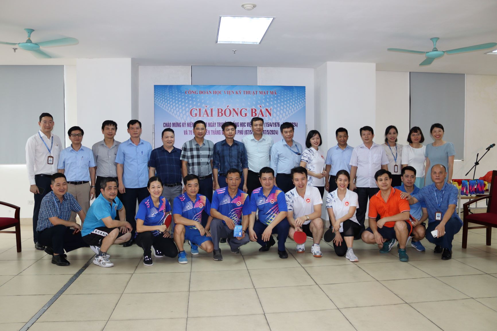 Các đại biểu, vận động viên, cổ động viên chụp ảnh lưu niệm tại Giải bóng bàn Công đoàn Học viện Kỹ thuật mật mã năm 2024