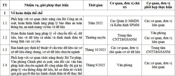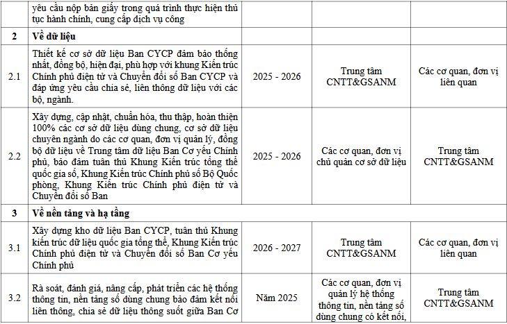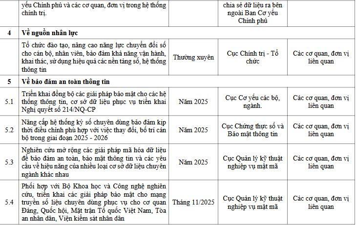 Nghị quyết số 214/NQ-CP ngày 23/7/2025 đã quy định, Ban Cơ yếu Chính phủ chủ trì triển khai đồng bộ các giải pháp bảo mật cơ yếu đối với hạ tầng hệ thống thông tin, cơ sở dữ liệu; nâng cấp hệ thống ký số chuyên dùng bảo đảm kịp thời điều chinh phù hợp với việc thay đổi, bố trí cán bộ trong giai đoạn 2025 - 2026; nghiên cứu mở rộng, triển khai các giải pháp mã hóa dữ liệu để bảo đảm an toàn, bảo mật thông tin và các yêu cầu về hiệu năng của nhiều loại cơ sở dữ liệu khác nhau, hoàn thành trong năm 2025. Phối hợp với Bộ Khoa học và Công nghệ nghiên cứu, triển khai các giải pháp bảo mật cho Mạng truyền số liệu chuyên dùng phục vụ các cơ quan Đảng, Quốc hội, Mặt trận Tổ Quốc Việt Nam, Toà án nhân dân, Viện kiểm sát nhân dân, hoàn thành trong năm 2025.