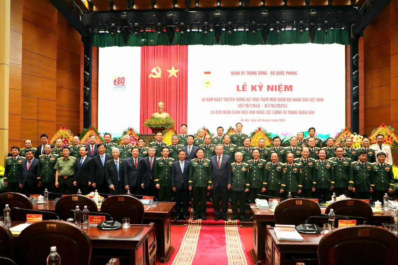 Sáng 6/9, Quân ủy Trung ương, Bộ Quốc phòng tổ chức Lễ kỷ niệm 80 năm Ngày truyền thống Bộ Tổng Tham mưu (BTTM) Quân đội nhân dân (QĐND) Việt Nam (7/9/1945-7/9/2025) và đón nhận danh hiệu Anh hùng Lực lượng vũ trang nhân dân. Tổng Bí thư Tô Lâm, Bí thư Quân ủy Trung ương dự và chỉ đạo buổi Lễ.