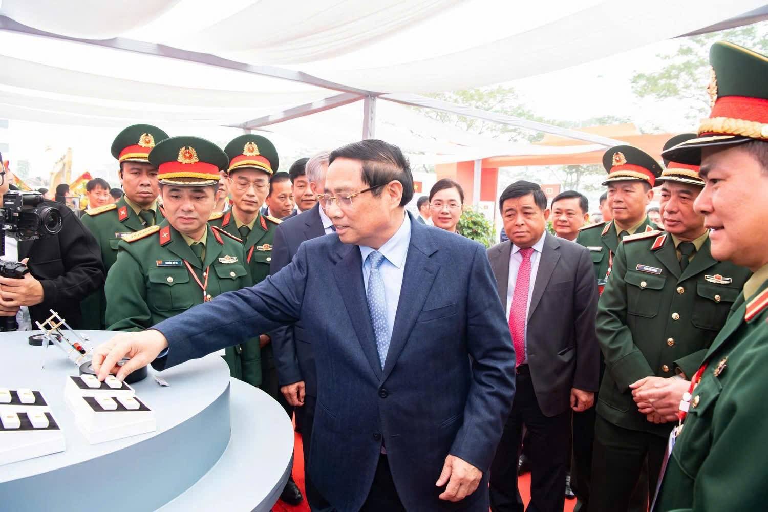 Tổng Bí thư Tô Lâm, Thủ tướng Chính phủ Phạm Minh Chính cùng các đại biểu tham quan gian trưng bày các sản phẩm mật mã của ngành Cơ yếu Việt Nam.