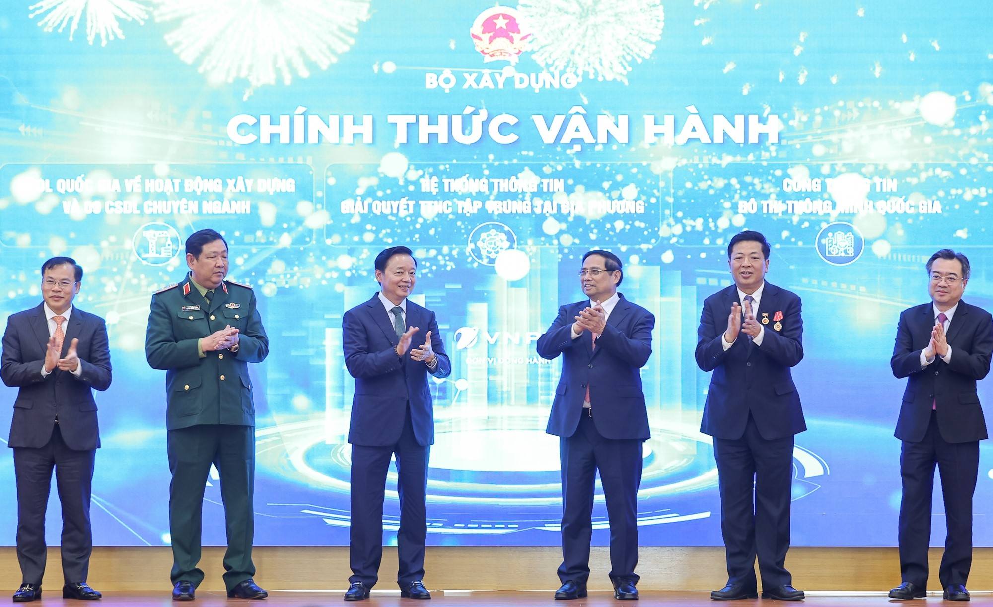 Thủ tướng Chính phủ Phạm Minh Chính cùng các lãnh đạo thực hiện nghi thức vận hành các hệ thống công nghệ thông tin của Bộ Xây dựng