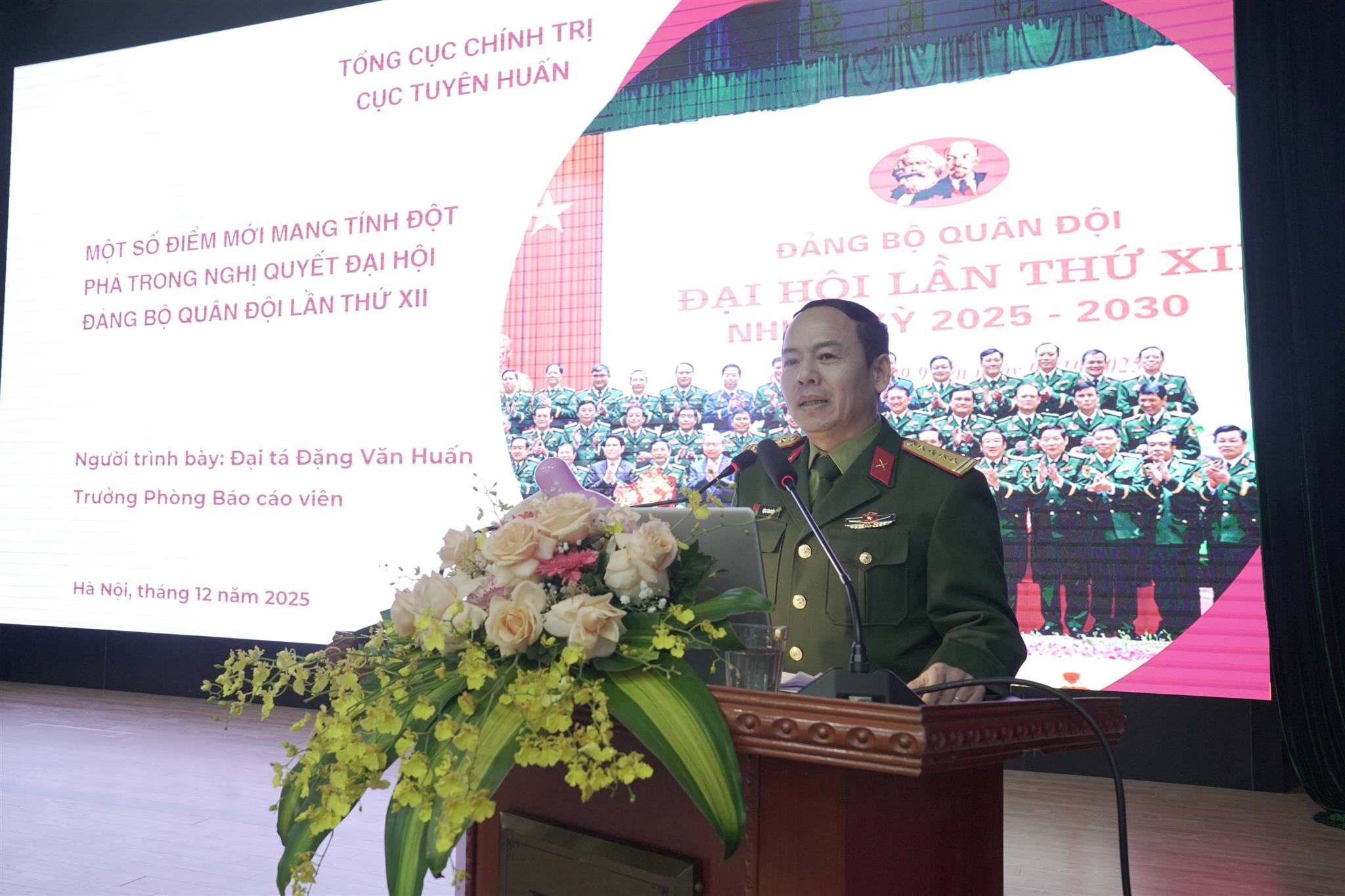 Đại tá Đặng Văn Huấn, Trưởng phòng Báo cáo viên Quân ủy Trung ương, Cục Tuyên huấn, Tổng cục Chính trị Quân đội nhân dân Việt Nam giới thiệu chuyên đề: “Một số điểm mới mang tính đột phá trong Nghị quyết Đại hội Đảng bộ Quân đội lần thứ XII”
