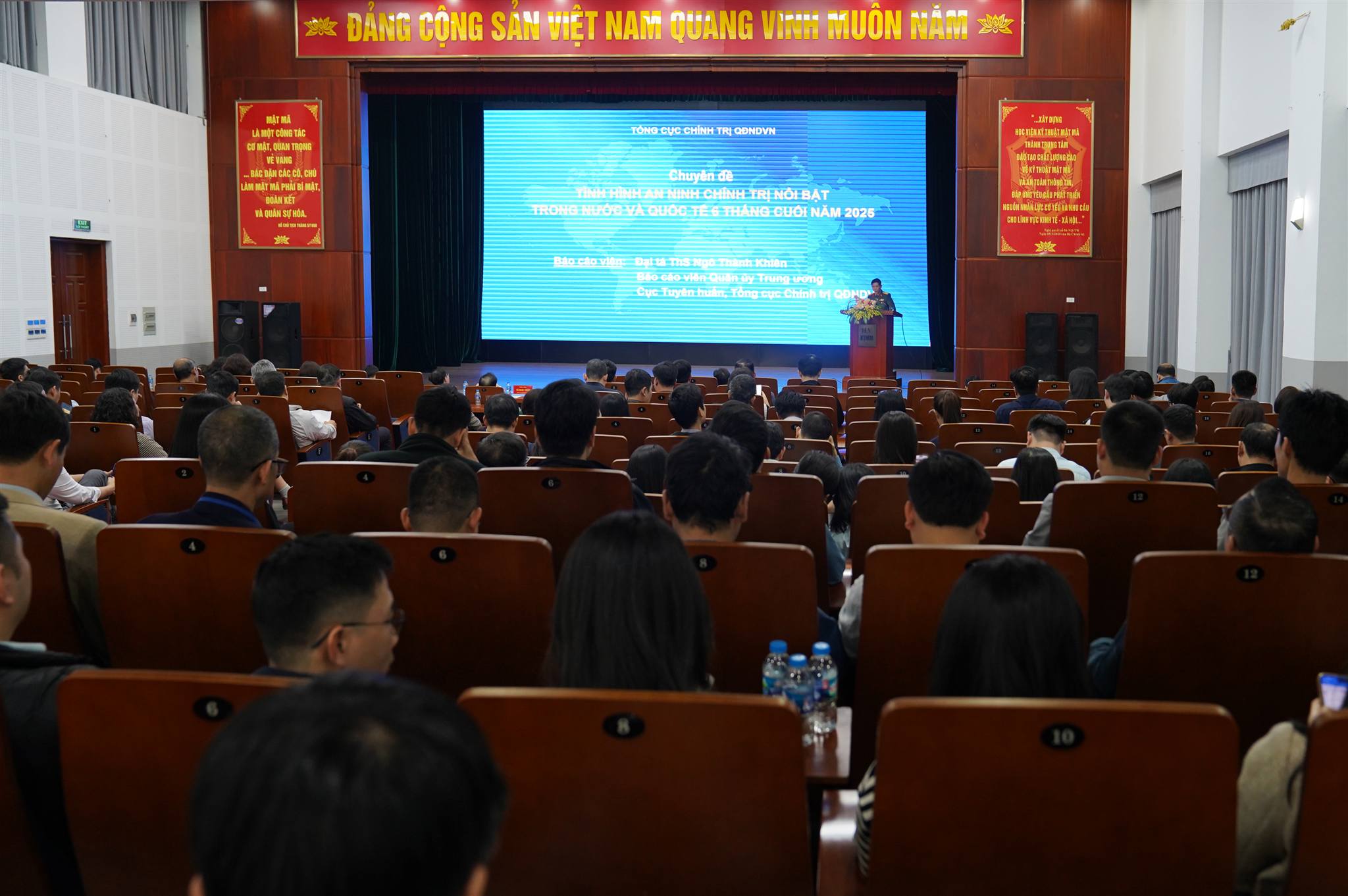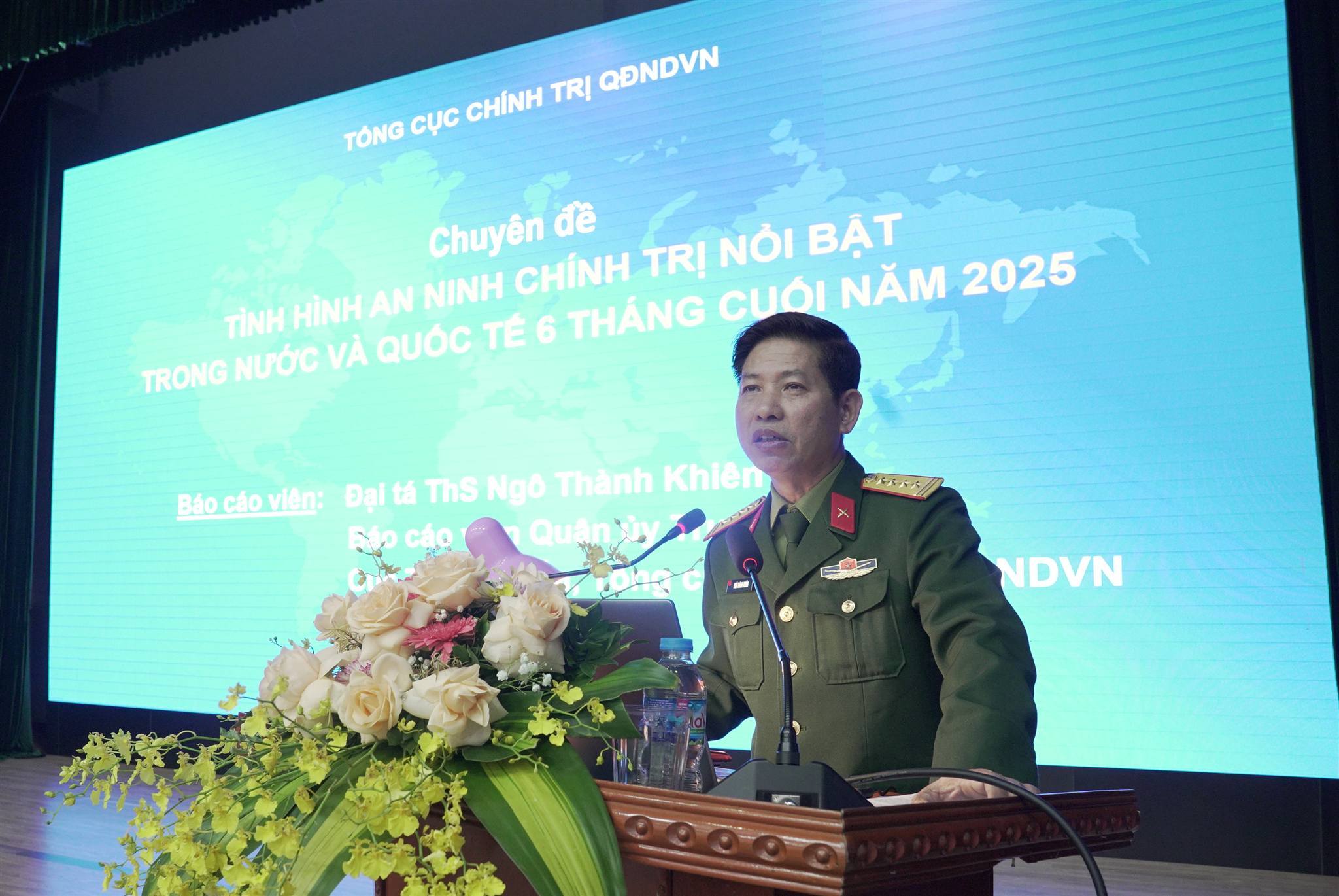 Cũng tại Hội nghị, Đại tá Ngô Thành Khiên, Phó Trưởng phòng báo cáo viên Quân ủy Trung ương, Cục Tuyên huấn, Tổng cục Chính trị Quân đội nhân dân Việt Nam đã trình bày chuyên đề "Tình hình an ninh chính trị nổi bật trong nước và quốc tế 6 tháng cuối năm 2025". Đồng chí phân tích sâu sắc bối cảnh thế giới đang tái định hình trật tự với sự cạnh tranh chiến lược gay gắt tại khu vực Châu Á - Thái Bình Dương, cùng các thách thức an ninh phi truyền thống ngày càng phức tạp. Đặc biệt đi sâu vào tình hình trong nước, Đại tá Ngô Thành Khiên nhấn mạnh đây là giai đoạn then chốt trong công tác xây dựng, chỉnh đốn Đảng và hệ thống chính trị. Đồng chí khẳng định quyết tâm chính trị cao của Đảng trong việc kiên quyết đấu tranh phòng, chống tham nhũng, tiêu cực; ngăn chặn, đẩy lùi sự suy thoái về tư tưởng chính trị, đạo đức, lối sống. Sự ổn định, trong sạch của hệ thống chính trị là nhân tố quyết định để đất nước vượt qua thách thức.