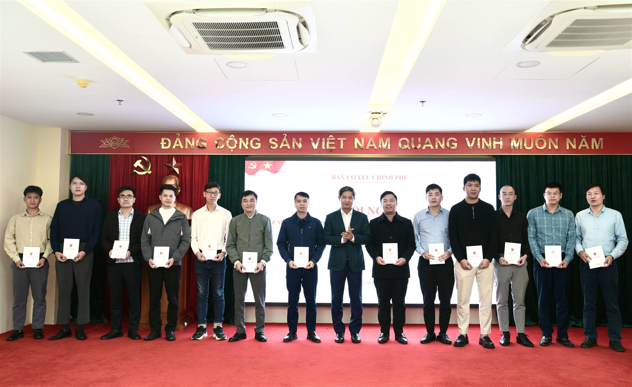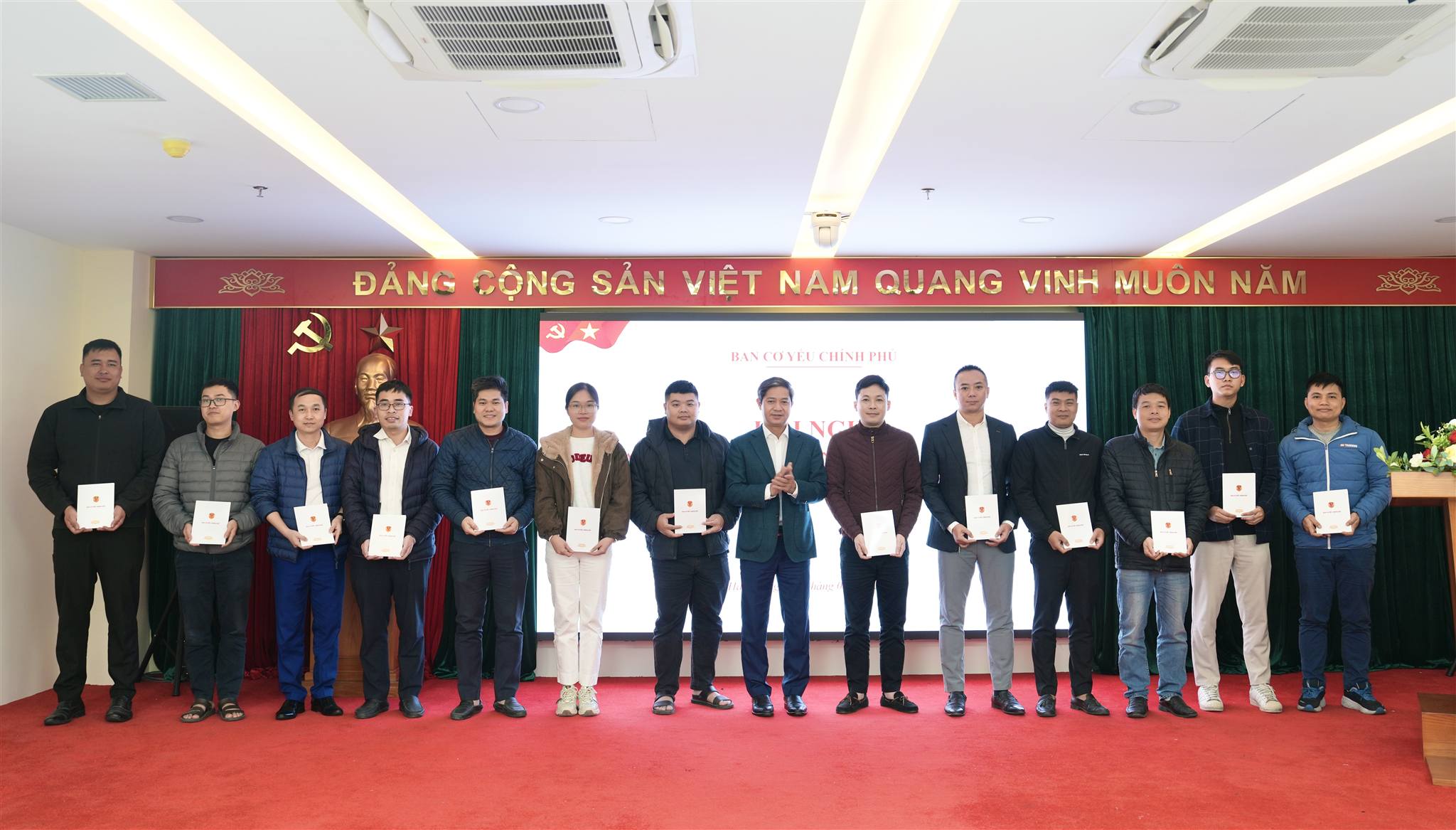 Đồng chí Nguyễn Hữu Hùng, Phó Trưởng ban Ban Cơ yếu Chính phủ trao quà tặng đồng chí Nguyễn Mạnh Hùng, Trưởng phòng Cơ yếu, Cục Chuyển đổi số - Cơ yếu Văn phòng Trung ương Đảng (bên trái) và thành viên Tổ triển khai.