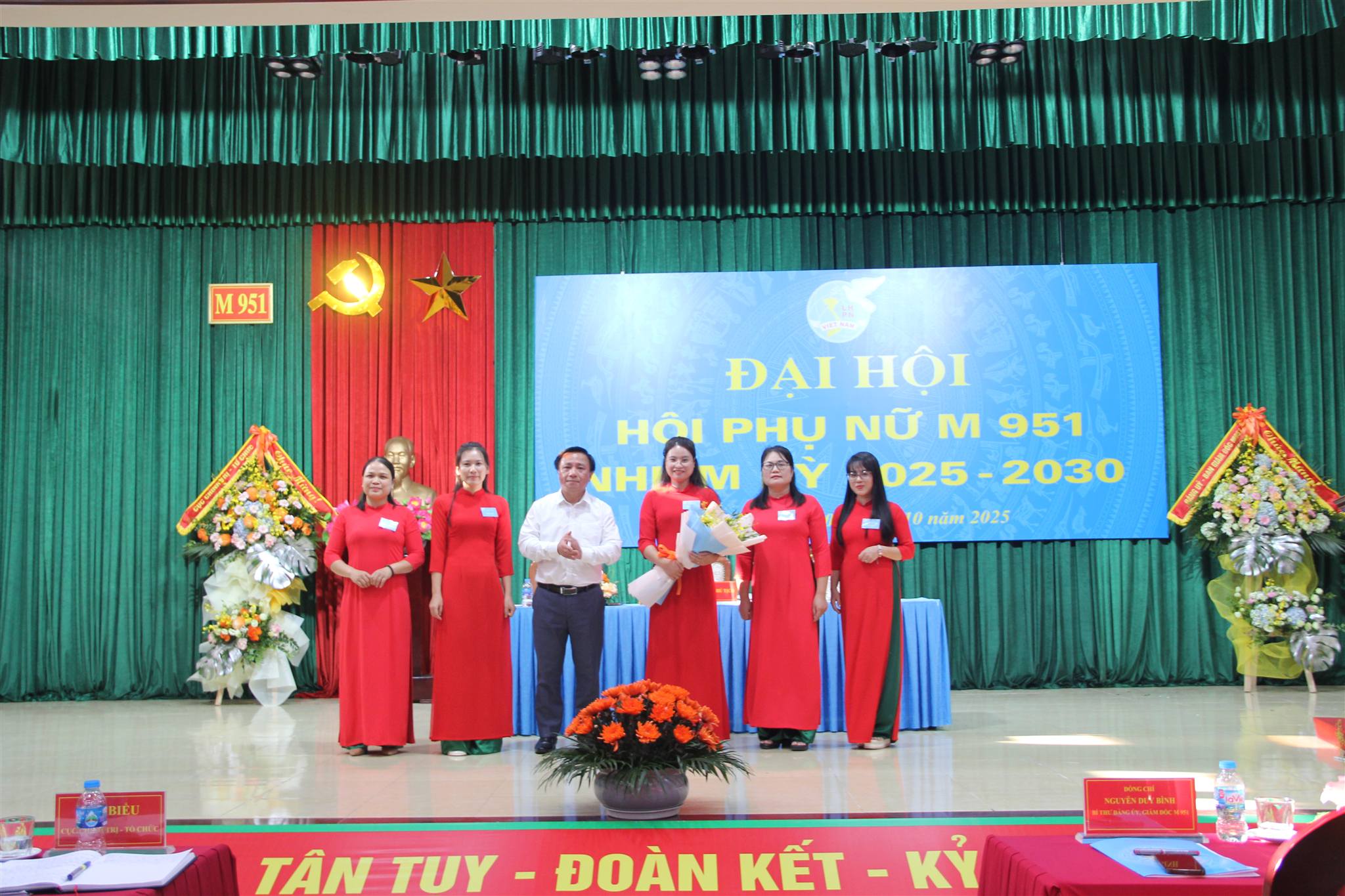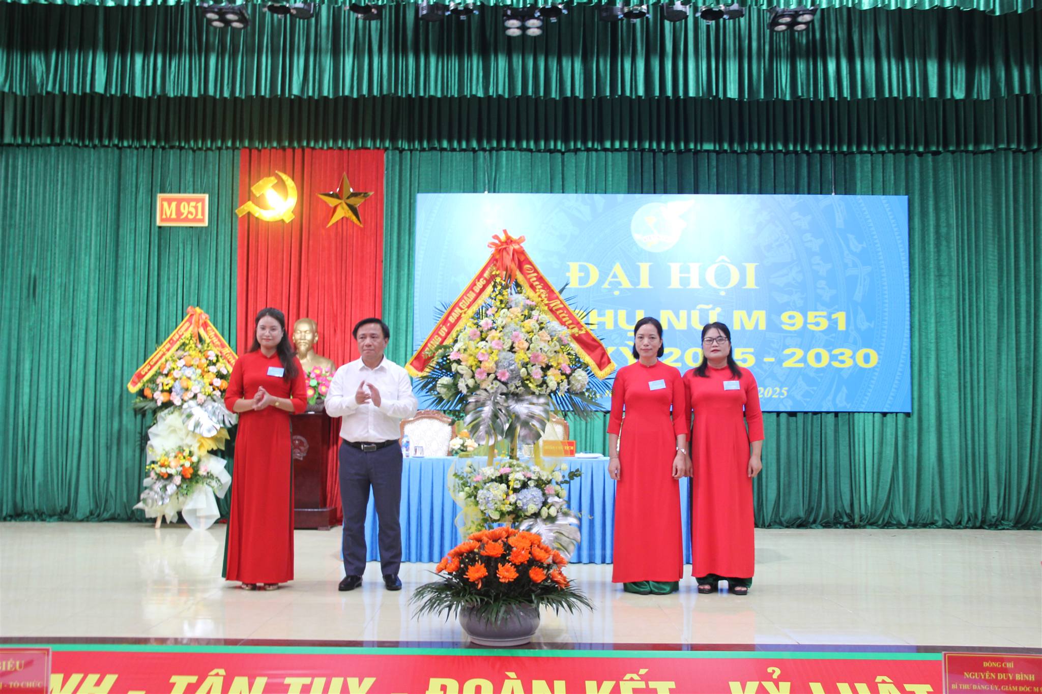 Đồng chí Nguyễn Duy Bình, Bí thư Đảng ủy, Giám đốc M 951 tặng hoa chúc mừng Ban Chấp hành Hội phụ nữ M 951 nhiệm kỳ 2025 - 2030.