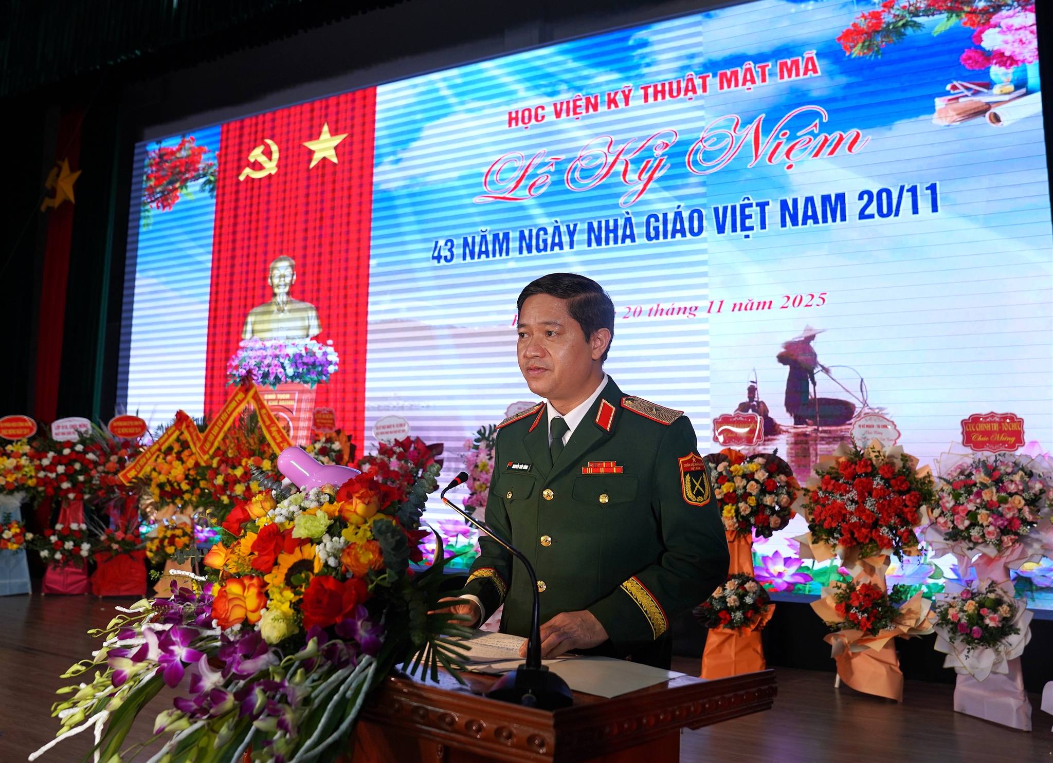 Phát biểu tại sự kiện, Đại tá Hoàng Văn Thức, Giám đốc Học viện Kỹ thuật mật mã gửi lời tri ân đến toàn thể các thầy, cô giáo, những người đã và đang thầm lặng cống hiến cho sự nghiệp “trồng người”. Đồng chí bày tỏ mong muốn các thế hệ học sinh, sinh viên tiếp tục phát huy truyền thống tôn sự trọng đạo, nỗ lực, giữ gìn kỷ luật, nuôi dưỡng ước mơ lớn và không ngừng cố gắng phấn đấu thành những công dân có ích cho xã hội, tiếp tục đạt được những giải thương xuất sắc trong các cuộc thi trong nước và quốc tế. Đồng chí cũng khẳng định Học viện sẽ tiếp tục đổi mới chương trình đào tạo, đẩy mạnh nghiên cứu, ứng dụng công nghệ mới nhằm đáp ứng yêu cầu bảo đảm an toàn, bảo mật thông tin trong tình hình mới.