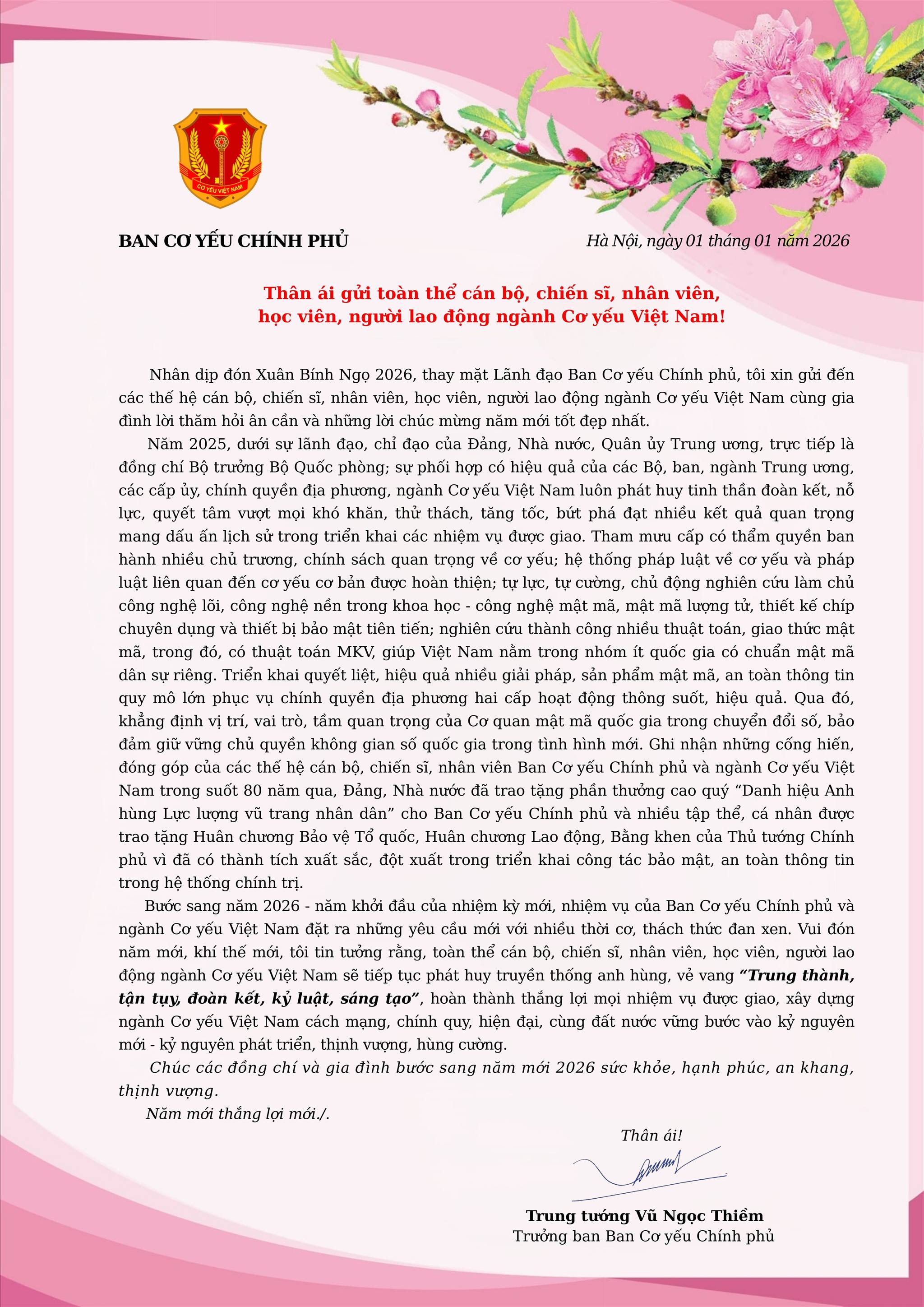 Thư chúc Tết của Trưởng ban Ban Cơ yếu Chính phủ
